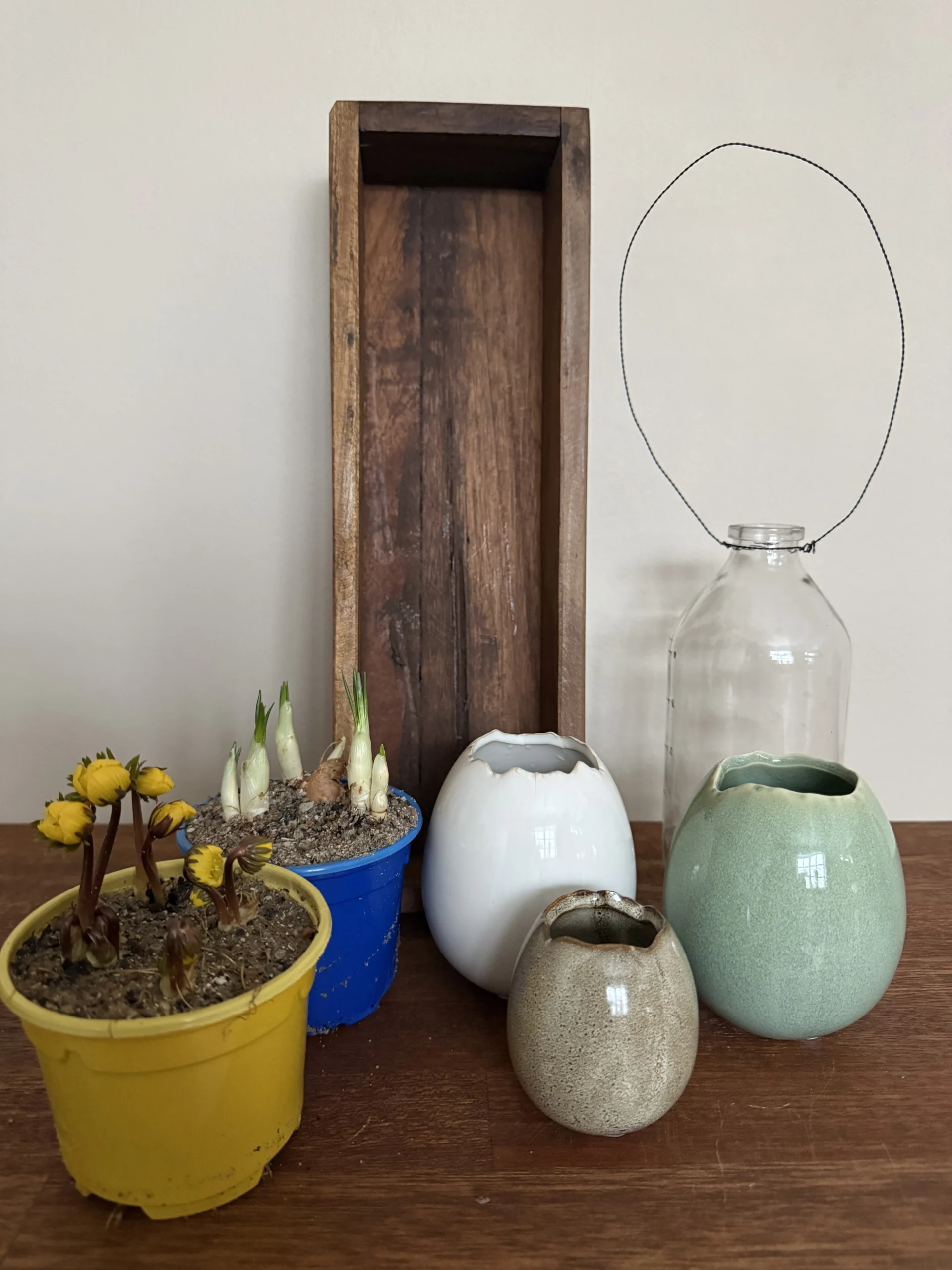 Æggevaser, glasvase og træbakke